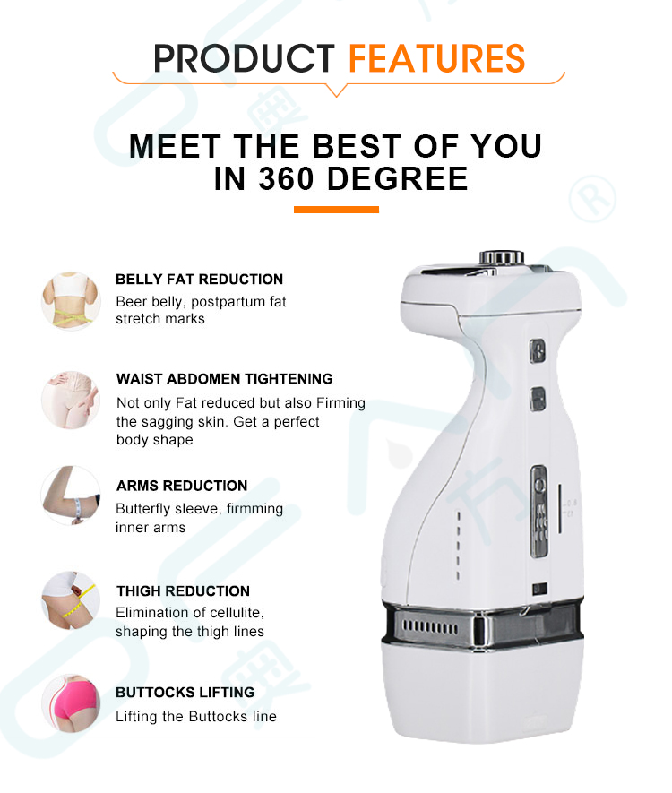 Two depths are available -- one is 0.8cm and the other is 1.3cm ( Which are obtained by focus test and pleated probe adjustment). The fat layers distributed at these two depths are focused into a plurality of focus rings, inducing the strong vibration of fat and further breaking and dissolving the fat,while the wave shock can improve the blood circulation and the skin metabolism.