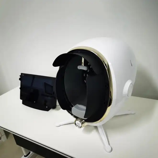 captures the images of facial skin through industrial-grade high-definition effects with 8 light sources such as white light, positive polarized light, negative polarized light, UV light, blue light, Wu's light, brown light, and red light. It adopts the technologies of spectral imaging, AI face recognition, deep learning, 3D skin simulation, cloud computing/cloud storage to conduct the quantitative analysis on the pathological features of surficial and deep skin, and comprehensively detect 14 indicators for skin health. Comprehensive analysis and evaluation of skin problems provide reasonable evidences for scientific and accurate management of the skin.